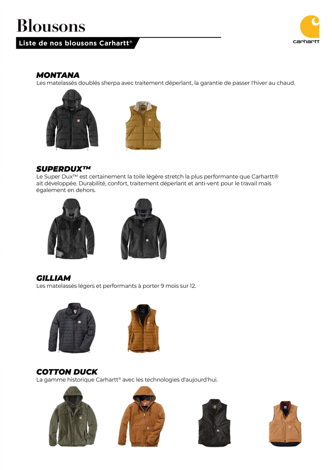 Carhartt® est la marque de vêtements de travail idéale des travailleurs exigeants ayant besoin de confort et de liberté de mouvement pour des produits comme les blousons, parkas et gilets. Carhartt® fait preuve de résistance et de longévité en utilisant diverses technologies, qui en font une marque premium avec un look unique !
